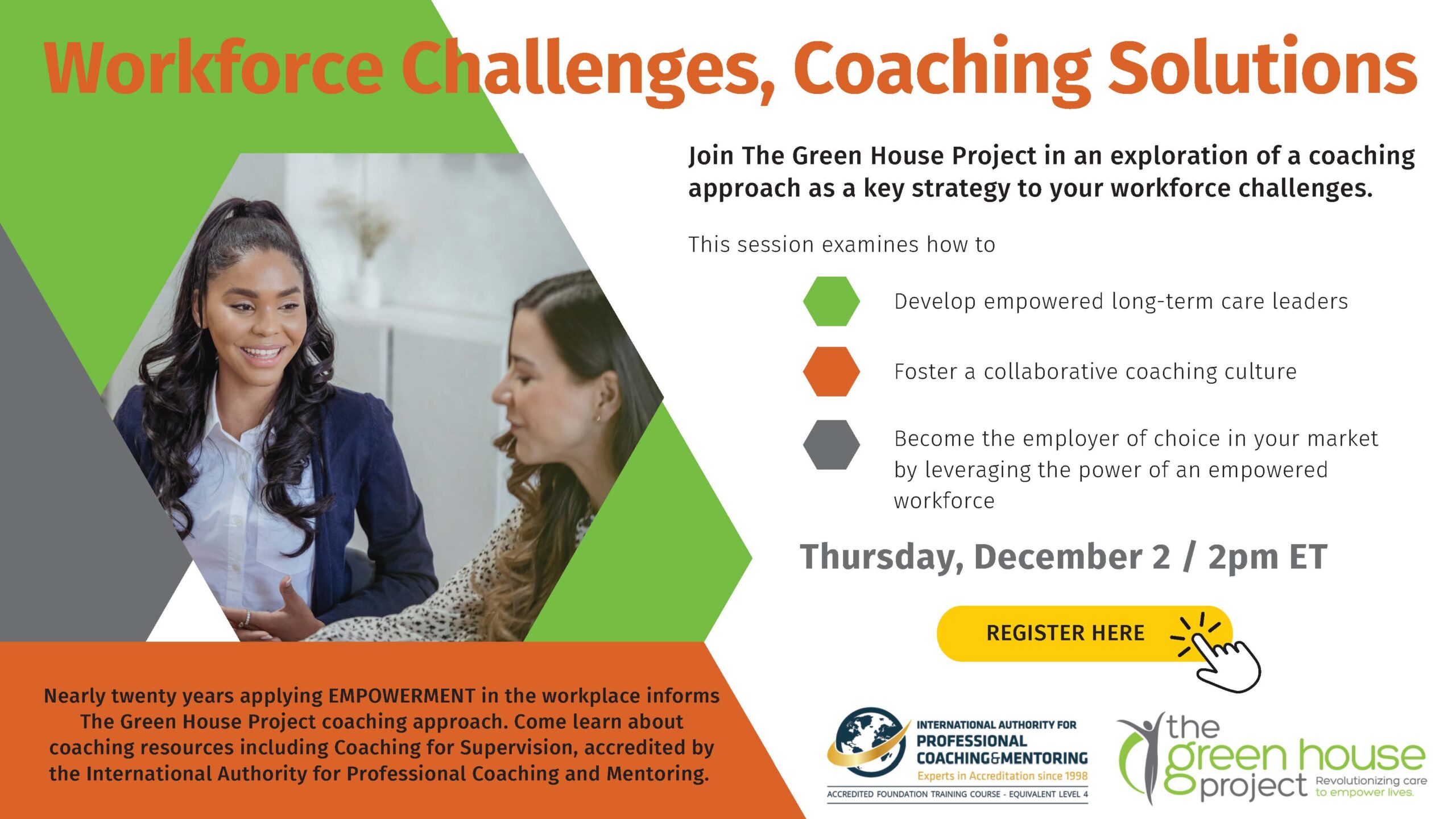 For nearly 20 years, the Green House model has fostered a collaborative coaching environment that makes adopters the employers of choice in their marketplaces. Join us to learn from that experience and discover strategies to help your team members lead through coaching – and make them your most vocal and valuable recruitment assets.
